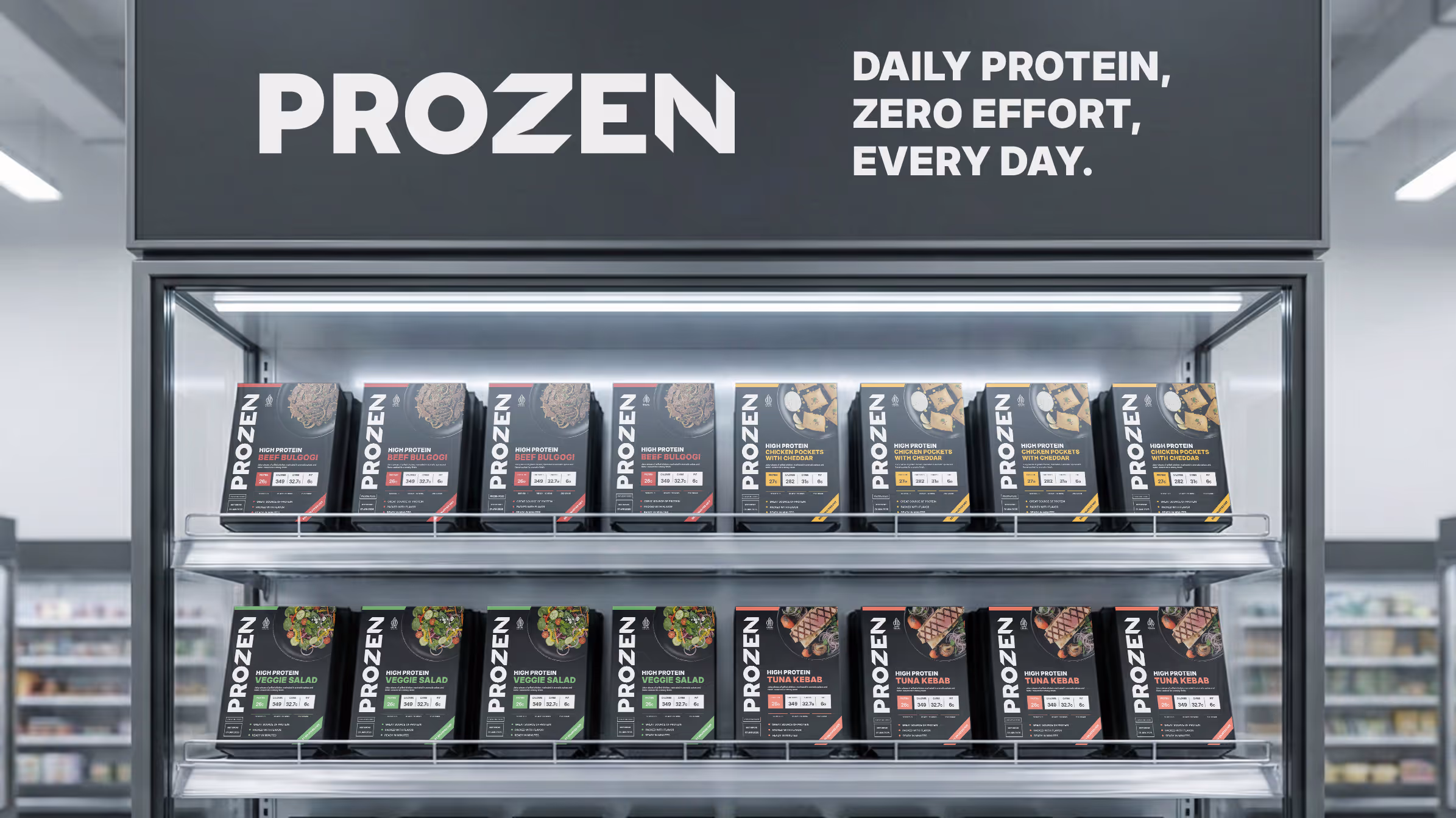 PROZEN is a modern frozen food brand designed to eliminate friction from everyday nutrition. It focuses on high-protein meals that are practical, efficient, and confidently simple. No unnecessary choices, no confusing claims. Just food that works.